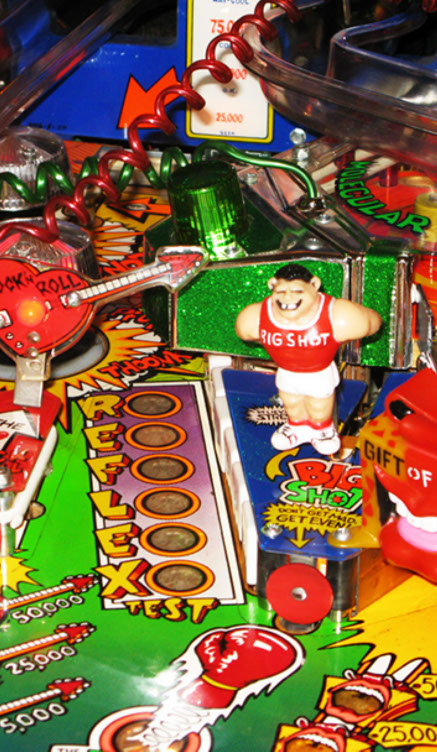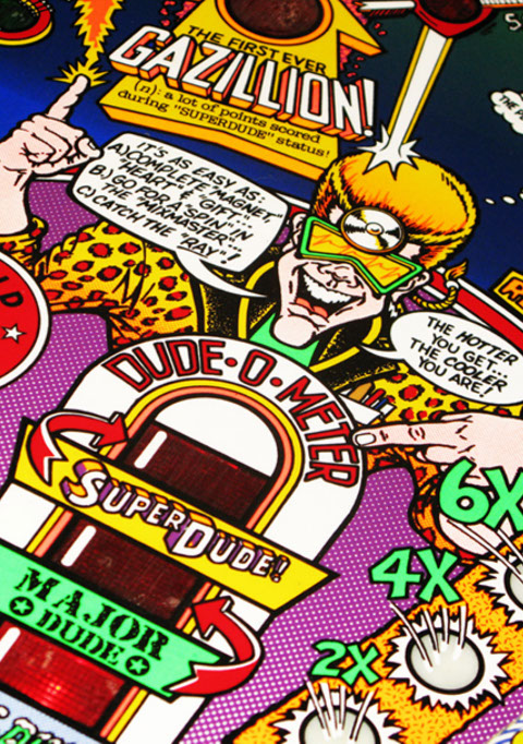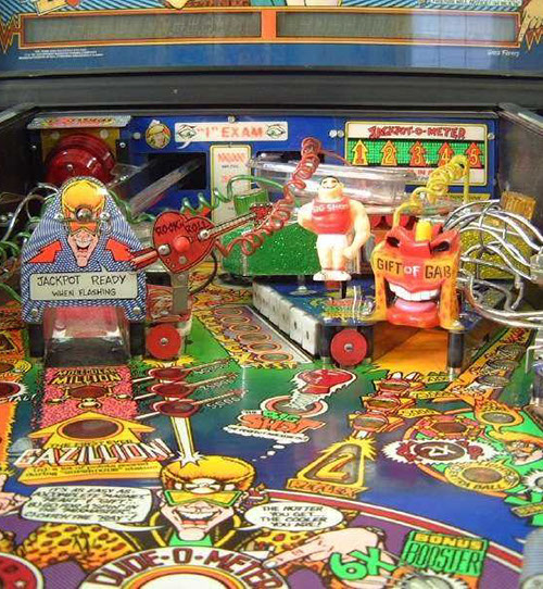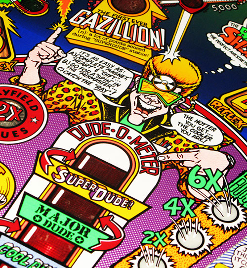 Further gameplay features include the Excellent Ray to start multiball, Big Shot - a bully figure that insults the player, the Molecular Mixmaster - a spinning disc with a rubber post on it, surrounded by targets and a Gazillion point shot with scoring that potentially multiple millions of points