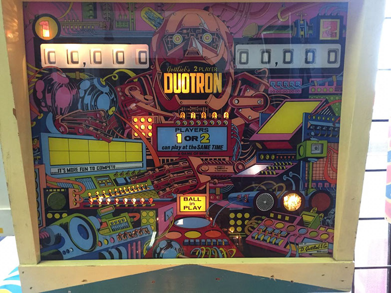 Duotron is a pinball machine from September 1974, manufactured by D. Gottlieb & Co., only just over 2500 units manufactured by Gottlieb back in the day. This is a very neat 2 player pinball machine, a must see. Works perfectly, serviced. Legs and door have been recently chromes.