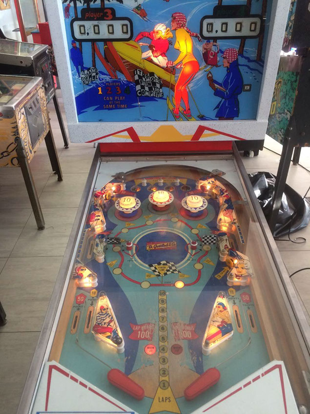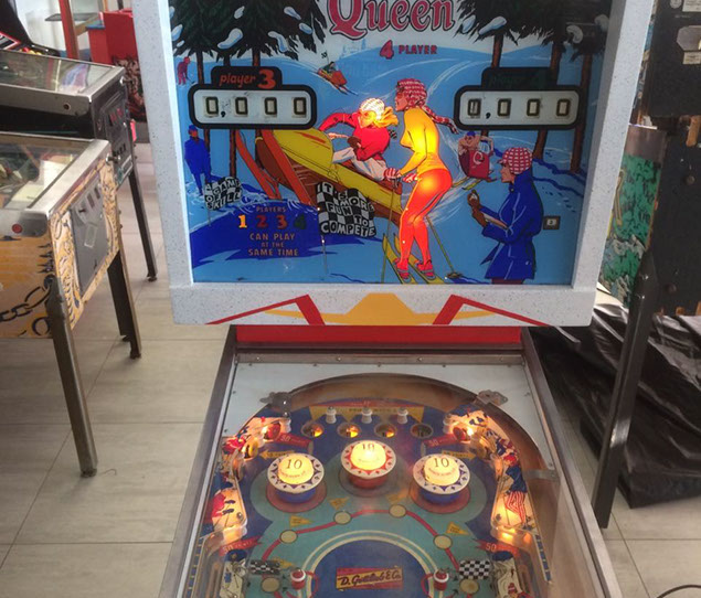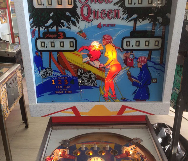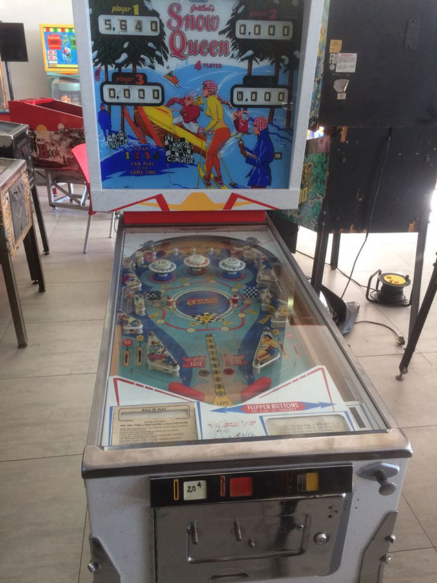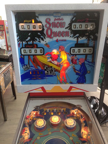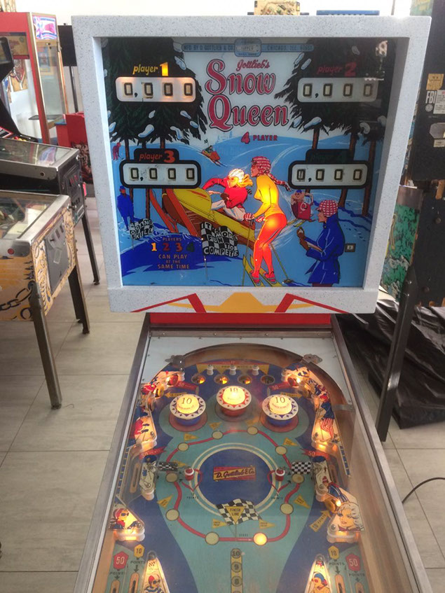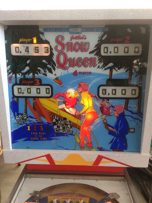 Gottlieb Snow Queen pinball, Gottlieb Snow Derby pinball. Same game, just different number of players (4 players versus 2 players). Gottlieb sold this game design in the two flavors, though they are essentially the exact same game (with artwork differences)