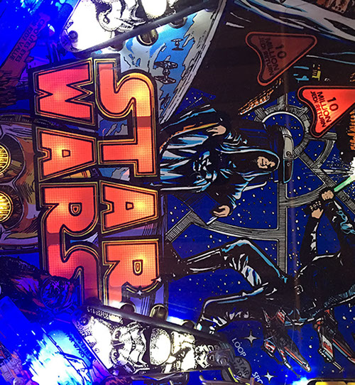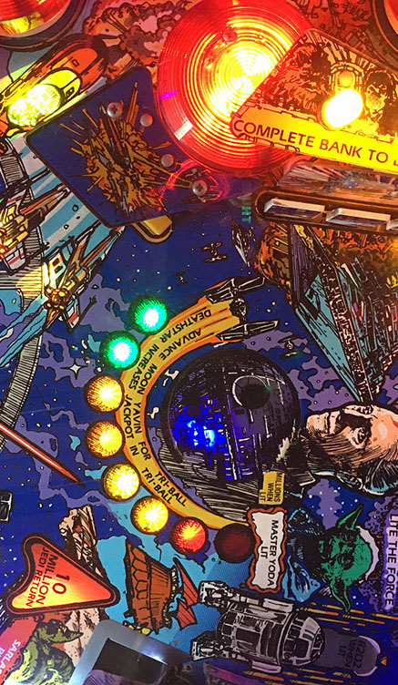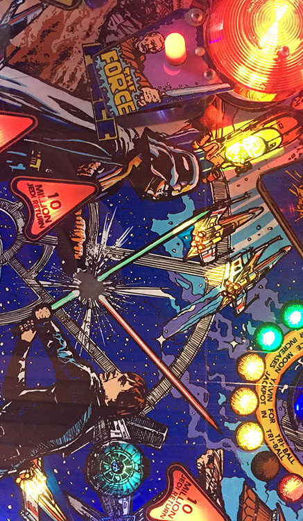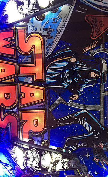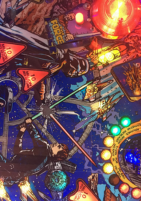 Based on the original trilogy of Star Wars movies, this pinball revisits key characters and scenes from those films. While the Death Star rotates into position around Yavin, dodge Star Destroyers and enter Hyperspace, then visit Master Yoda and collect a Force award. Enter the Sarlaac pit and collect Jabba's Bounty, then shoot the Death Star and start Tri-Ball for a chance at the Double Jackpot. Go for the ramp to collect more bonuses and awards, but don't get distracted by R2's bouncing and whistling.